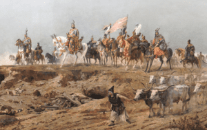 One of the foundational paintings of Hungarian national imagination is the Arrival of the Hungarians by Árpád Feszty.