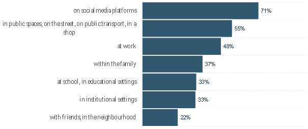 The findings underscore the amplifying role of social media: nearly three-quarters (71 per cent) of respondents aged 15 to 39 report having encountered generational conflict on social media platforms. Public spaces, such as streets, represent the second most common setting, with 55 per cent reporting such experiences, reflecting the fact that these spaces are typically shared with strangers. Fewer than half of respondents report experiencing generational conflict in the workplace, approximately one-third within the family or in educational and institutional settings, and just over one-fifth within their neighborhoods.