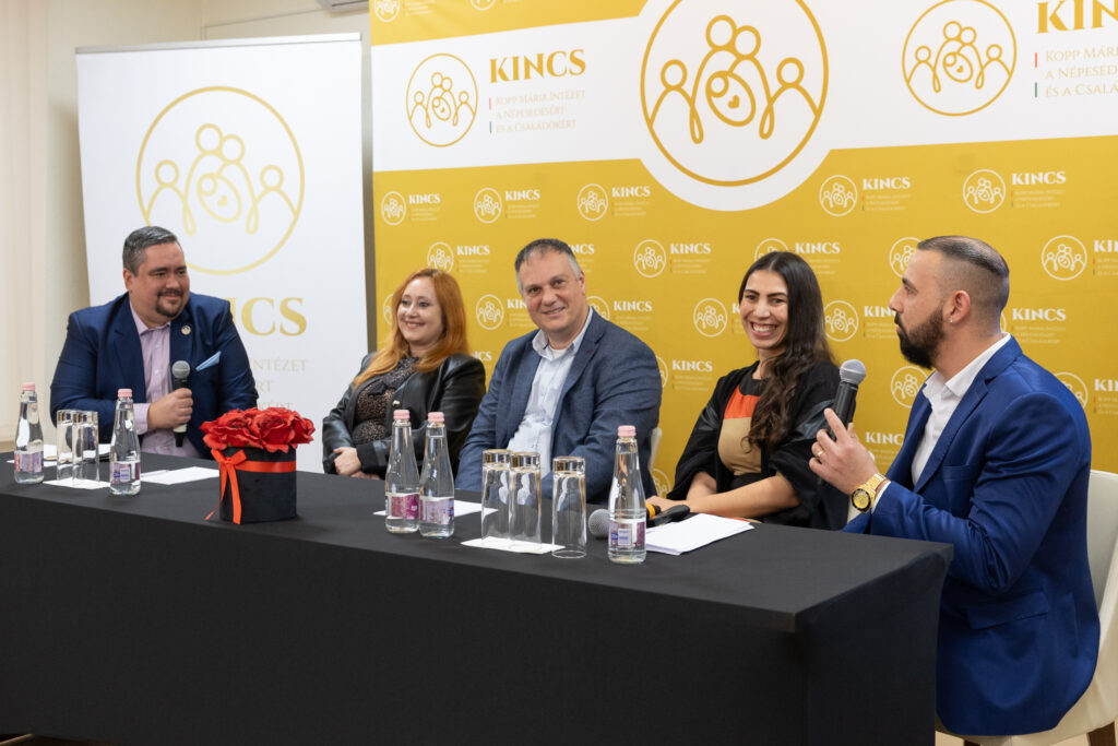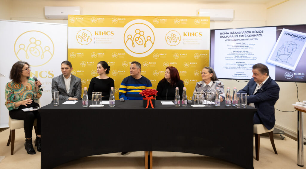 The second roundtable focused on cultural values and the question of what Roma couples pass on to their children and to society. Moderated by KINCS researcher and editor Mónika Raffael, the discussion featured jazz pianist Károly Nyári and his wife, music teacher Edit Lányi; Kálmán Káli-Horváth, director of the Budapest Reformed Roma College, and his wife, pedagogue Marianna Borkó; as well as communications professional Tibor Balogh and his wife, child-protection officer Virág Baloghné Balog.