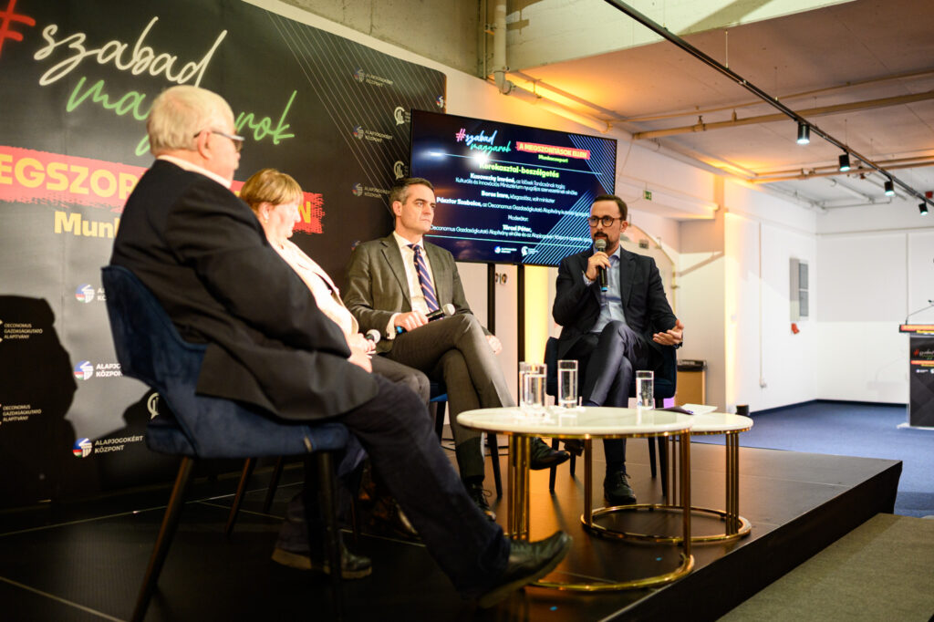 After Director Szánthó’s remarks, a four-person panel gathered on stage. It featured Imre Boros, Former Minister of Agriculture during the first Orbán administration; Professor of Economics at the Ludovika University of Public Service Dr Szabolcs Pásztor; and Imréné Kusovszky, member of the Council of the Elderly. Péter Törcsi of the Oeconomus Economic Research Foundation served in the role of the moderator.