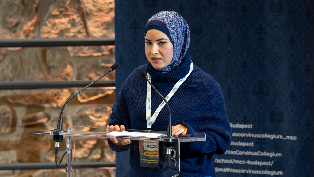Mohamad Ali El-Husseini’s daughter delivers his keynote in English. PHOTO: Tamás Gyurkovits/Hungarian Conservative