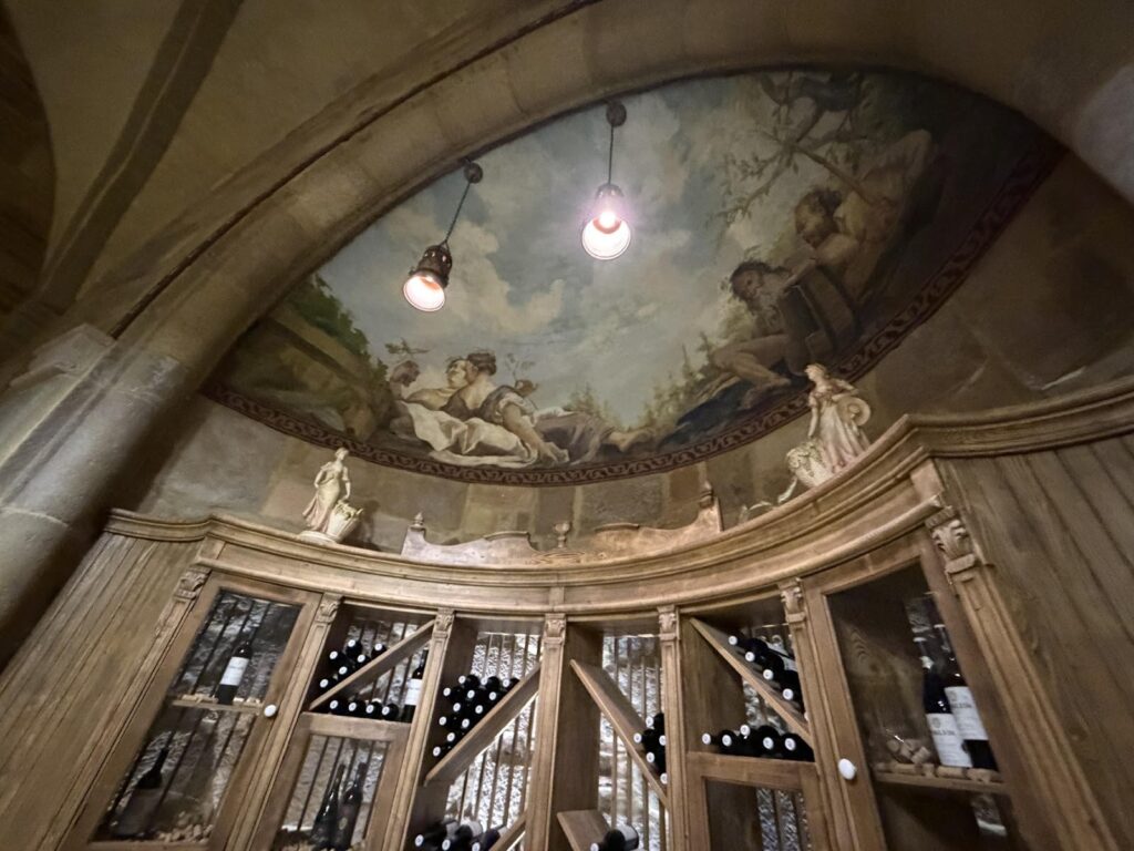 Adjacent to their rows of barrels, there is a hall where wine tasters can sip the various wines amidst an apse of an allegory of agricultural harmony, flanked by a statue of Our Lady of Lourdes and a fresco of St. Michael the Archangel slaying the devil in the form of a dragon.