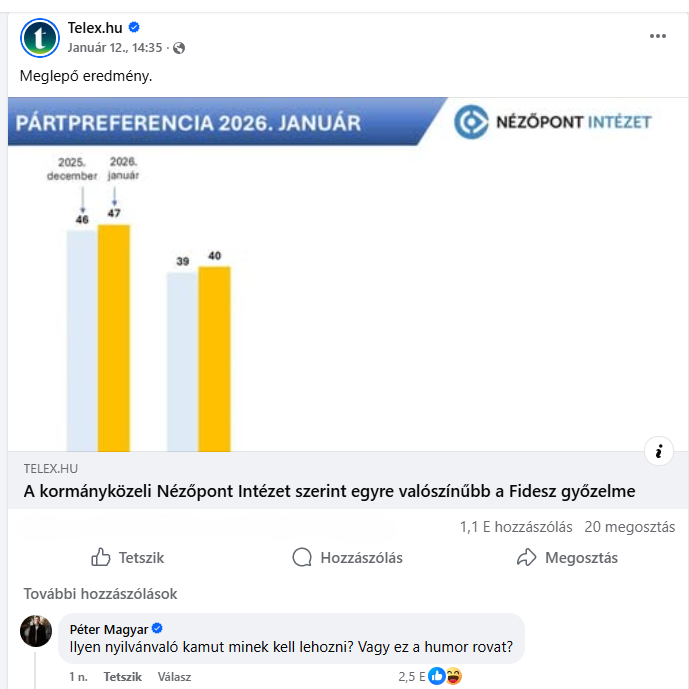Like Metz, Orbán’s opponents often complain about the imbalance of the media landscape in Hungary. Just to set the record straight: among the top five online news outlets in the country, there are three opposition sites, one neutral outlet, and none that are pro-government. Telex, the most popular online news outlet in the country, is essentially the mouthpiece of Tisza and Péter Magyar. The opposition leader makes sure that the outlet republishes his social media content by literally commenting on every single one of its articles, mobilizing his online fanbase to harass journalists and effectively gaslighting the outlet into covering the topics he favours. I know this sounds insane, but here is some recent proof: