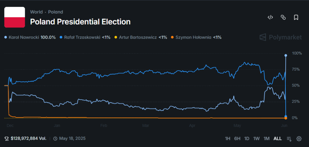 On the eve of the Polish presidential election run-off in June 2025, both Polymarket and many pollsters favoured liberal-progressive Warsaw mayor Rafał Trzaskowski over PiS-backed candidate Karol Nawrocki. Just hours before the vote, Polymarket gave Trzaskowski more than a 70 per cent chance of victory, while Nawrocki’s chances stood below 30 per cent. In reality, Nawrocki won the second round and became President of Poland with a razor-thin margin of 50.89 per cent.