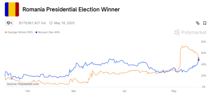 Polymarket also failed to predict the outcome of the Romanian presidential election in May 2025. A month before the first round on 4 May, Polymarket gave Nicușor Dan a 39 per cent chance of winning and George Simion a 29.5 per cent chance. However, when Simion finished first by a large margin in the first round, his odds quickly overtook those of Dan. Between the two rounds, Simion’s chances rose above 70 per cent and remained above 50 per cent until election day. In the end, Dan won the presidency by a relatively comfortable margin in the second round, securing 53.6 per cent of the vote.