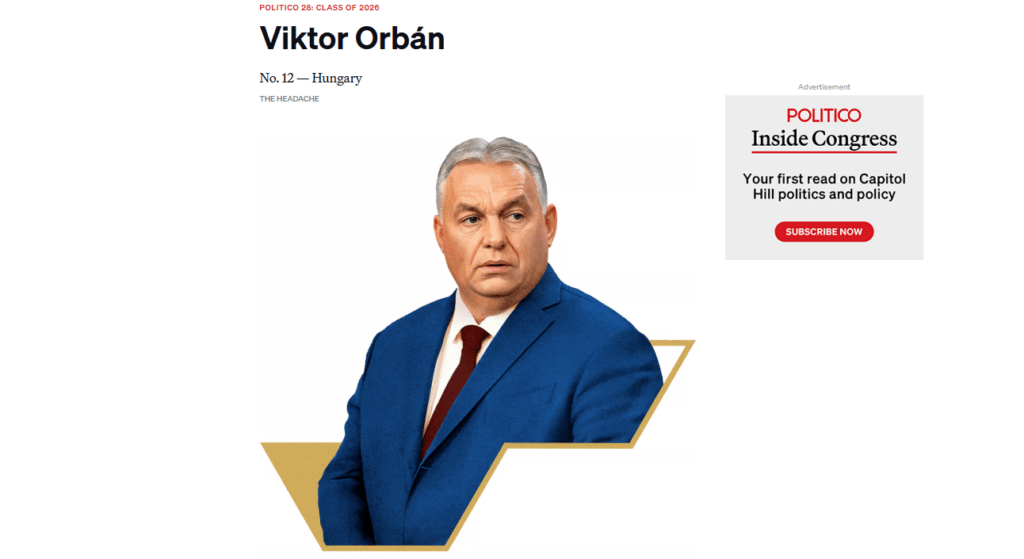 First off, they gave PM Orbán the less-than-flattering tagline ‘The Headache’. As they explain, ‘The war in Ukraine turned Viktor Orbán from a peripheral irritant into a structural headache for the European Union—and Brussels still hasn’t found a cure. Once a liberal reformer, Orbán, 62, has spent more than a decade recasting Hungary into what he proudly calls an “illiberal democracy”—consolidating media control, undermining the judiciary and cementing his Fidesz party’s grip on power.’